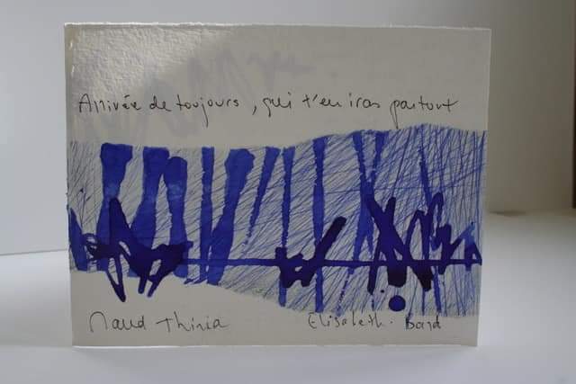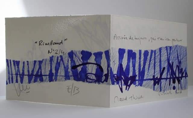 En tant que poète, j’ai réalisé un livre pauvre pour Daniel Leuwers, Arrivée de toujours, qui t’en iras partout, avec l’artiste Elisabeth Bard, collection « Rimbaud », 2021