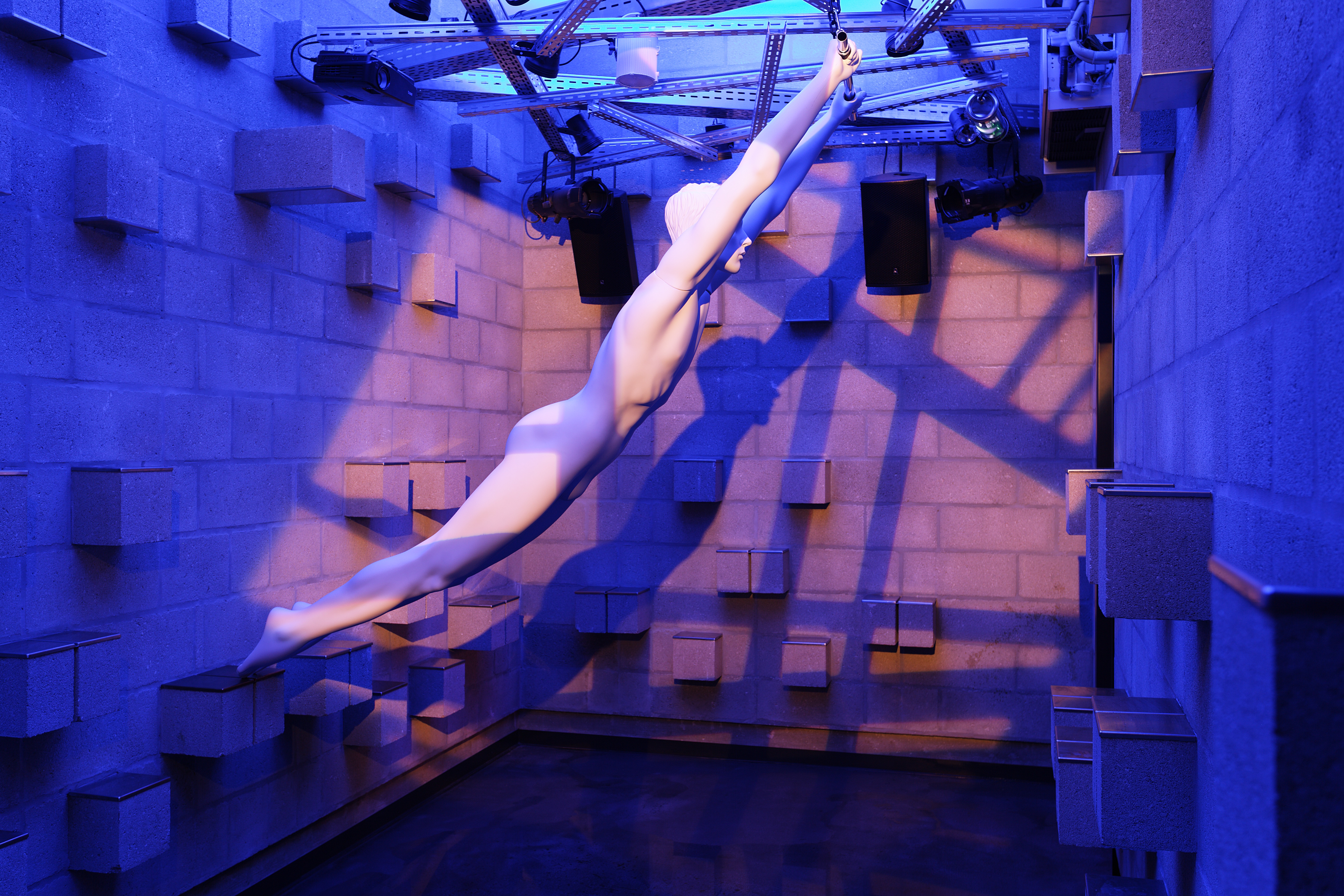 les yeux plissés par trop d’éclat, de la blancheur de son sillage aux teintes cuivrées de la lumière sur son visage, je le vois, sur son trapèze il vole, suspendu là, dans la fragilité de l’air qui vibre ici comme nulle part ailleurs, entre deux blocs, qui l’eût cru, il danse, il se balance, il meurt et naît à chaque phase de son mouvement de lune, parmi les étoiles des feux de la rampe, entre les rires des trompettes et les cymbales de peur d’un rythme effréné de voltige, entre le sol d’un noir de jais qui miroite comme une eau son image et la forêt de barres métalliques entremêlées où s’accroche solitaire son tissage, il pend et fend l’air, dans un horizon d’air et de feuilles, dans une moiteur d’humus où les stries des branches lui éraflent les mains comme des clous, oiseau de nuit, il danse, danse son ombre sur les murs de parpaings qui sortent comme des rangées de mains, danse son reflet dans l’eau sur les cercles infinis que son pied trace, oui danse autour de moi, et le vertige me prend qui tombe, n’y eût-il toutes ces mains, tous ces embranchements d’ailes qui me soutiennent et me caressent, me suspendent là aux poutrelles d’acier de mon désir, je suis là, rouge et bleu, dans le cercle infini des heures enfuies, là, suspendu, nu et tellement vivant que mes tempes battent à mon front une cadence insoutenable, au rythme des tambours et des troubadours psalmodiant leurs vers ondulant comme des flammes, tout bat en moi à tout rompre, l’orage a percé dans la brume et les vapeurs de ceux qui semblent là sans y être, je sens leur haleine chaude dans ma nuque quand ils me frôlent, leurs becs de feu dans la lumière en cercle qui me baigne, halo de nuit et d’or, et pourtant je suis seul avec mon trapèze, membre qui me prolonge ici et ailleurs, prolonge mon chant, oiseau de nuit, presque envolé, prendre élan dans les vibrations de l’air qui m’emportent, et les bruits du dehors qui surgissent, cris stridents, sirènes hurlant leur chant ancestral qui rend fou, prendre élan dans les rugissements des fauves et les craquements des mains ouvertes, roulement de tambours, mon cœur chavire dans la blancheur troublée du jour, léger trapèze de plumes et d’os, je sens ma queue jaillir dans un cri parmi les basses à tout rompre qui montent au gré de ma jouissance et les couleurs du ciel qui percent dans l’explosion des sens, jusqu’au silence d’une heure bleue, le corps en brume, les bras déployés dans un bruissement d’étoffe et d’aile, enfin, je vole et te rejoins ici où l’aile de l’oiseau a percé les limites du ciel entrouvert, je me suis éveillé