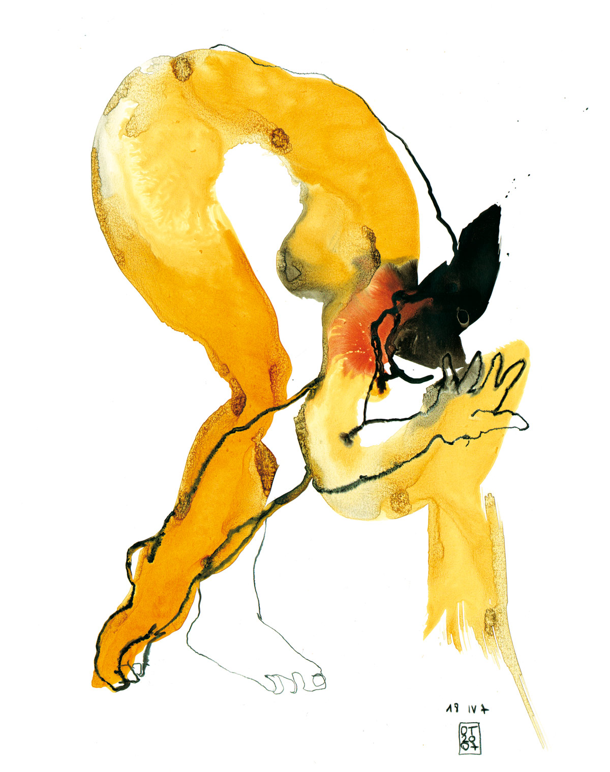 Si je me courbe ainsi c’est pour mieux prendre racine. Je prends corps par des mains qui façonnent et m’entourent, en saisissent le chant qui m’anime et me tend. Je me replie en moi pour que remonte le sang et refluent l’air qui vibre et la voix des absents, car le temps coule en moi qui suis femme éternelle, faite d’écorce et de chair résonnant sous ta main. On dirait que je danse comme un arbre dans le vent sur une musique de feu qui soudain fait silence. Sentir en soi le vide par ses morsures de givre – mon pied blanc du papier laisse transparaître le grain et cette lumière de neige nébuleuse et limpide. Sentir en soi le vide par sa force de vie qui borde comme un drap léger qui se soulève, cette solitude en soi qui apaise et console comme une chaleur de braise après l’hiver des sens. C’est l’enfance qui remonte sous la femme qui se penche et accueille les souvenirs dans des pelletées de terre. J’ai les mains comme des feuilles qui s’ouvrent pleines vers toi, vers les lueurs d’un ciel fait d’orages et de souffle. J’ai les pieds dans la terre et tout mon corps ondule, ancrée et si légère que la couleur s’épand, racontant mon histoire par une main en élan, dans une coulée de sève sur la feuille un instant. La couleur de ma peau a l’automne en murmure et mon dos arrondi fait écho en calebasse à tous les mots d’amour que je porte en mon sein. Le noir qui me sillonne trace un chemin de vie, de mon pied qui s’élève à ma main qui recueille. Il s’étend et prend source en ma chevelure brune, mucus sombre et humide, tourbe et boue, terre féconde, bois d’ébène dont la sève coule encore fraîche et nue, dans l’épaisseur légère de mon corps lourd qui danse le désir insensé de durer sur la toile par les mains qui accouchent et le regard qui sème.